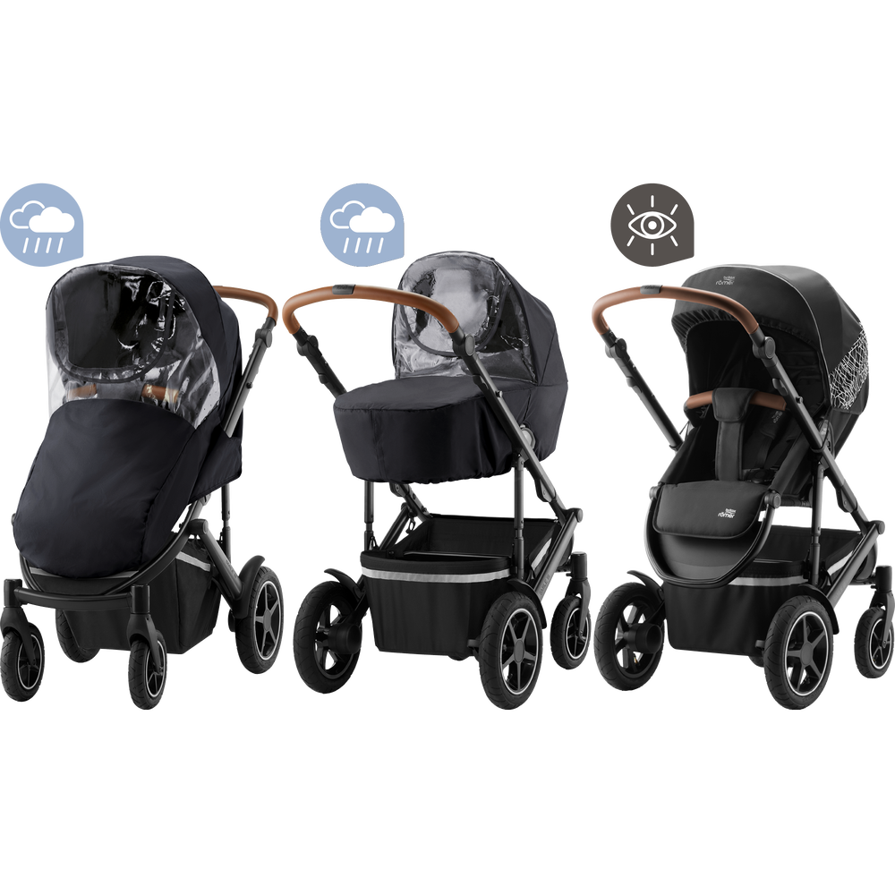 Kuomu ja sadesuojat sopivat Britax Smile III ja 4 yhdistelmävaunun vaunukoppaan ja rattaisiin. Heijastinkuomu on helppo kiinnittää paikalleen samoin kuin sadesuojat.