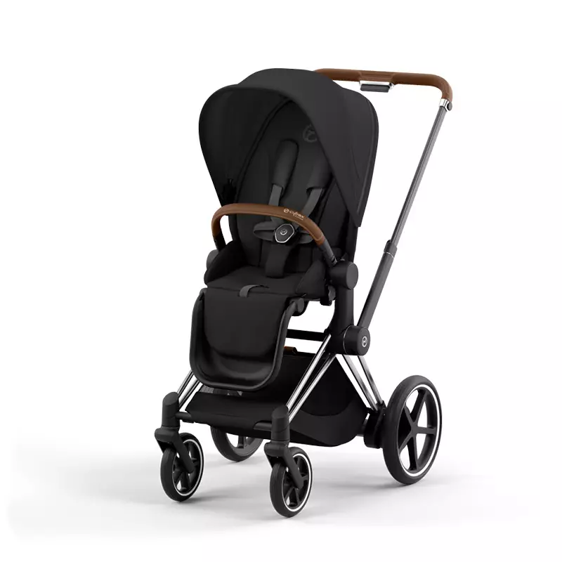 Cybex ePriam 4 sähköavusteiset lastenrattaat Chrome Brown-rungolla. Tässä rattaassa on mukana elektroninen avustin rungossa. Näillä rattailla ylämäetkin tuntuvat yhtä kevyiltä kuin tasainen jalkakäytävä.