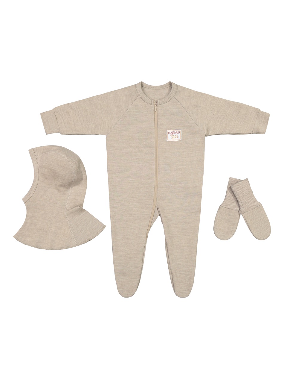 Ruskovilla vauvan ulkoilusetti Hiekka Merinovilla, Ruskovilla 40 v juhlatuote on vauvan villasetti, joka sisältää villahaalarin, kypärämyssyn ja lapaset.