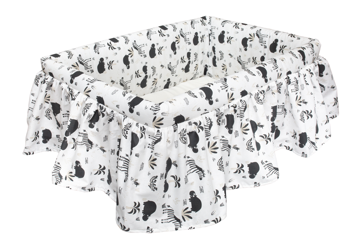 Äitiyspakkauksen reunapehmuste Anne & Mikael Hippo on mustavalkoinen pehmuste. Reunapehmuste sopii kokonsa puolesta äitiyspakkaukseen ja pehmustaa kovat reunat mukaviksi vauvalle. Reunapehmuste myös somistaa äitiyspakkauksen pahvikuoren, jolloin vauvan ensisänky näyttää erityisen somalta.
