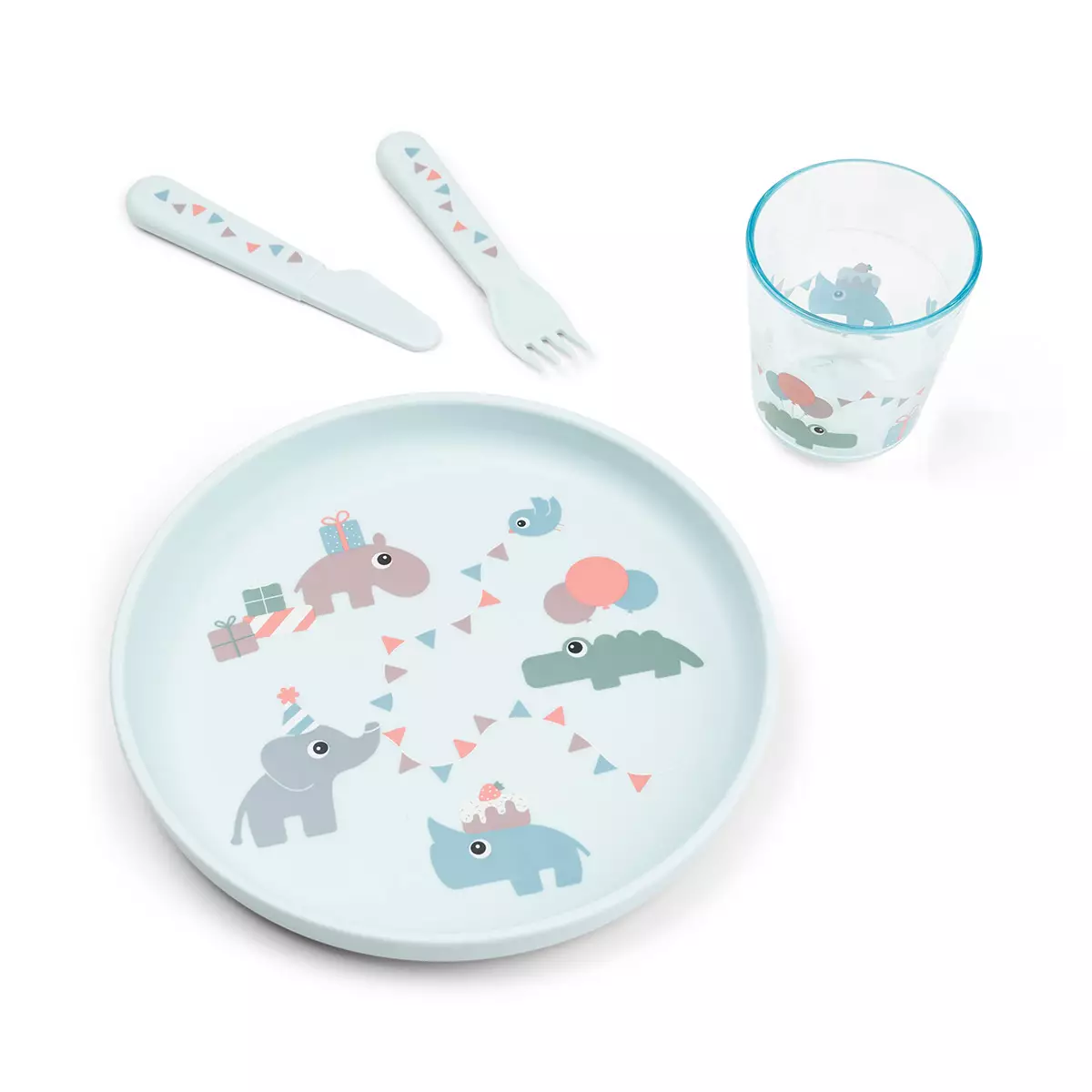 Done By Deer Foodie ruokailusetti Celebration Blue on ihastuttava setti lapsen ruokailuhetkiin. Kauniit sileäpintaiset astiat sopivat juhlavampaankin kattaukseen. Lautasen pohjassa on liukumaton reunus pohjassa.
