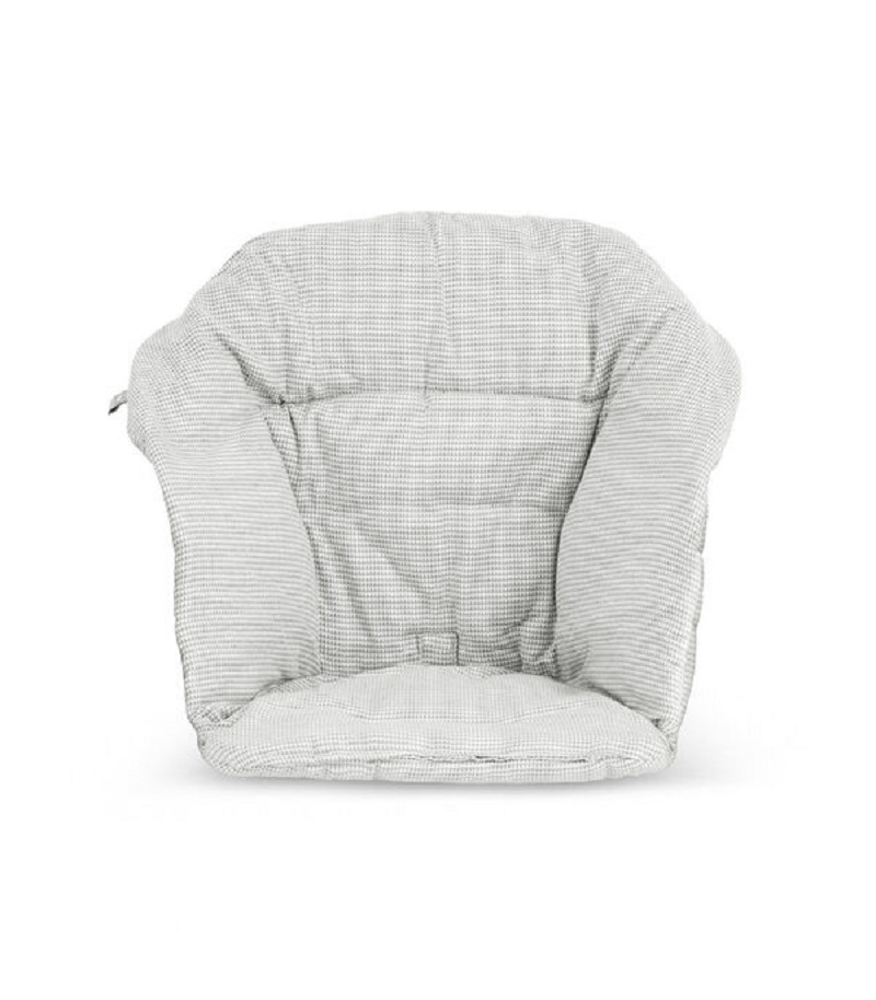 Vaalean harmaa Nordic Grey istuinpehmuste Stokke Clikk syöttötuoliin. Kaunis kuosi ja sopii moneen sisustukseen.