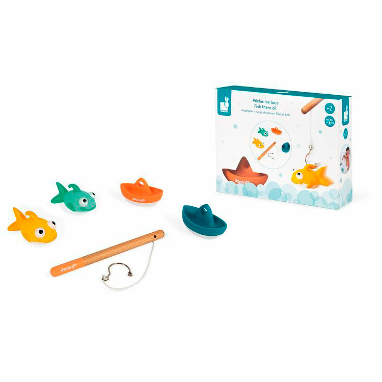 Janod Kalastajan kylpylelu on hauska toiminnallinen lelu kylpyhetkiin. Onnistutko nappaamaan ongenkoukkuun kaksi kalaa ja kaksi kumivenettä?