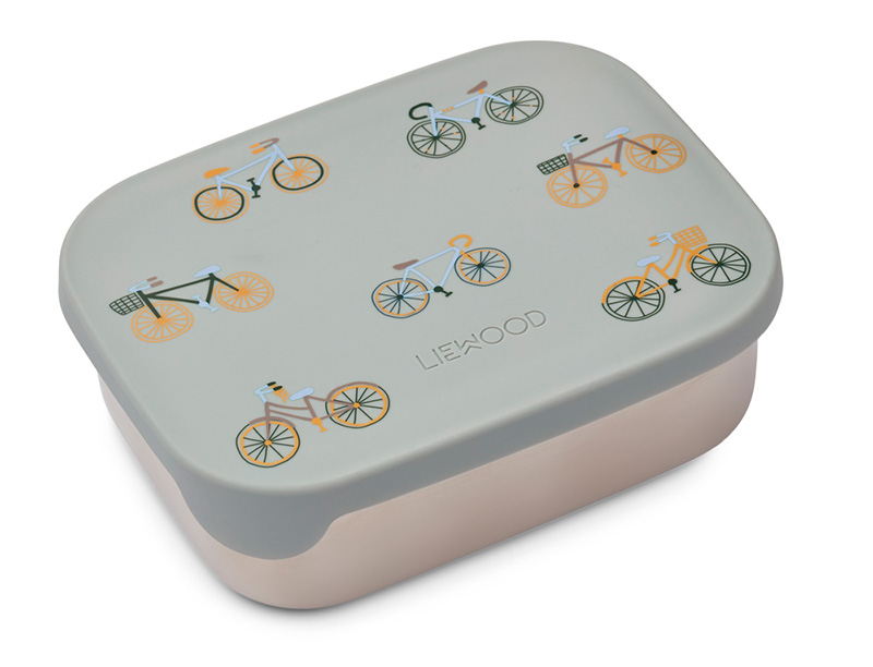 Liewood Arthur eväsrasia Bicycle cloud blue on kolmeen osaan jaettu teräksinen eväsrasia silikonisella kannella. Astian kannesta saat erillisen lautasen ruokailuun.