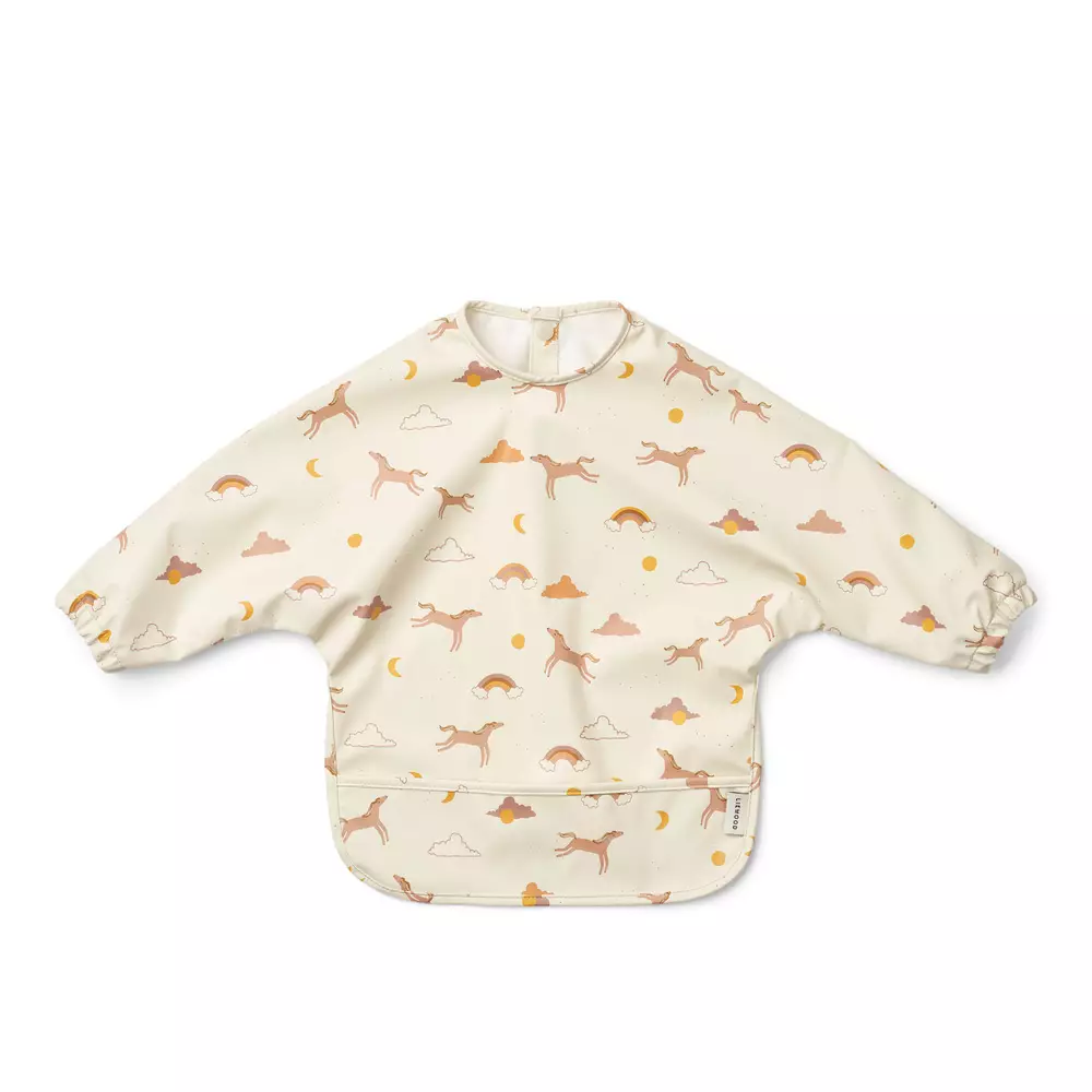 Liewood Merle ruokalappu hihoilla Dream/Ecru on hihallinen suoja, jota voi käyttää myös lapsen maalailussa tai muissa sotkuisissa puuhissa. Suojaa tehokkaasti hihoja myöten lapsen vaatteita. Sormiruokailussa erittäin kätevä. Helppo ja nopea puhdistaa - huuhtele ja pyyhi puhtaaksi! Ruokalapun etuosassa tasku. Ruokalapussa hauska heppa-kuosi.