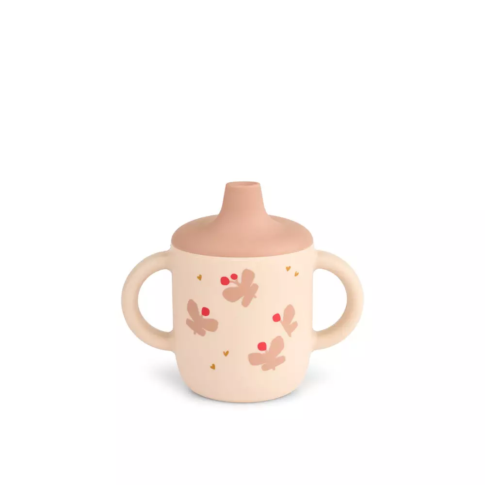 Liewood Neil nokkamuki kahvoilla Butterfly/Apple blossom on 100% silikonia. Nokkamuki on helppo pitää kädessä ja silikonisen pinnan ansiosta se ei pääse liukumaan pöydän pinnalla. Nokkamukissa on leikkisiä perhosen kuvia.