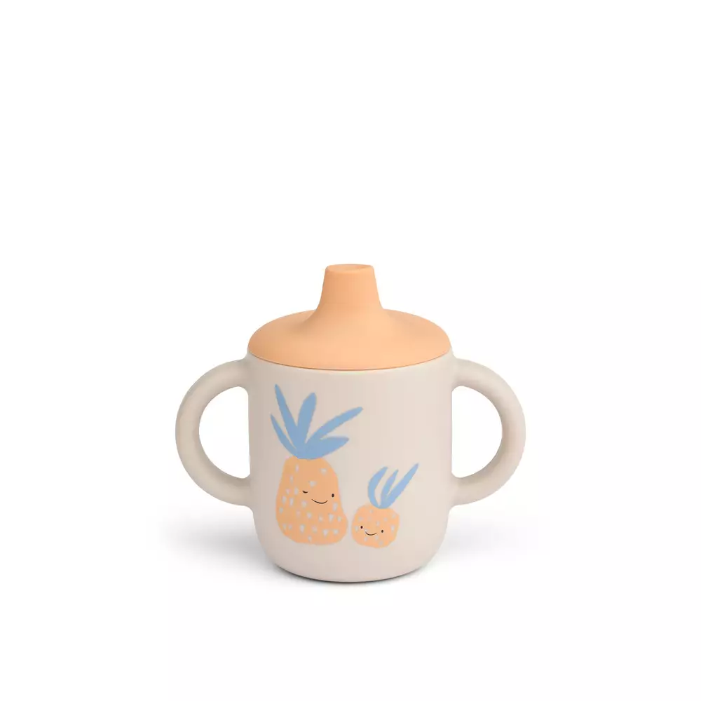 Liewood Neil nokkamuki kahvoilla Pineapple/Sandy on 100% silikonia. Nokkamuki on helppo pitää kädessä ja silikonisen pinnan ansiosta se ei pääse liukumaan pöydän pinnalla. Nokkamukissa on leikkisät ananaksen kuvat.