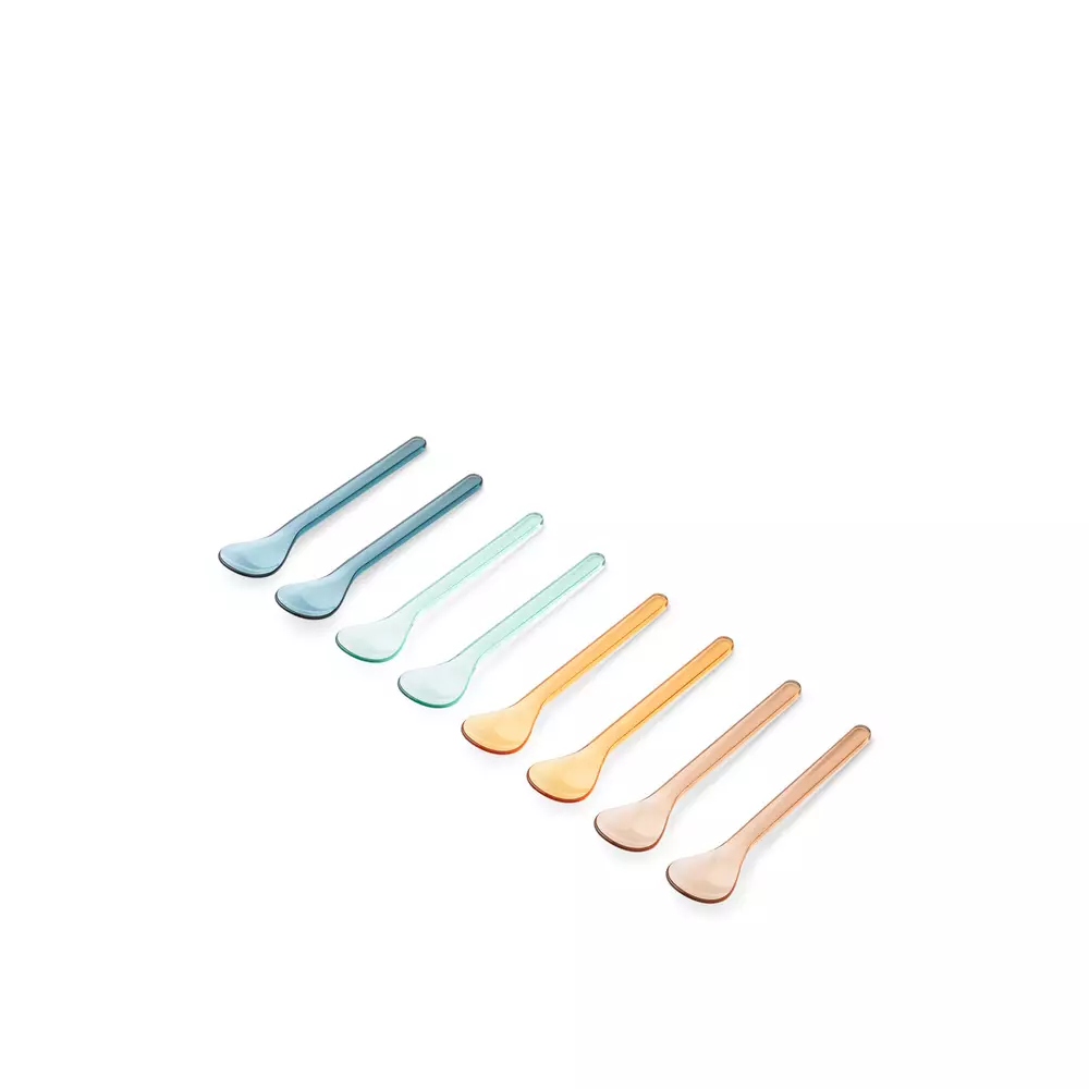 Kahdeksan värikästä ja läpinäkyvää lusikkaa ovat valmistettu erittäin kestävästä ja särkymättömästä tritanista. Kestää konepesun.