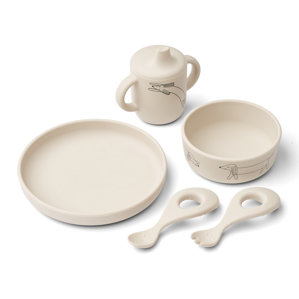 Liewood Ryle ruokailusetti dog/sandy on silikoninen kestävä ruokailuvälinesetti lapselle. Sopii hyvin vaikka lahjaksi! Liewood ruokailusetin mukana tulevat nokkamuki, lautanen, kulho, lusikka ja haarukka. Kaikki ovat 100% silikonia ja turvallisia käyttää.