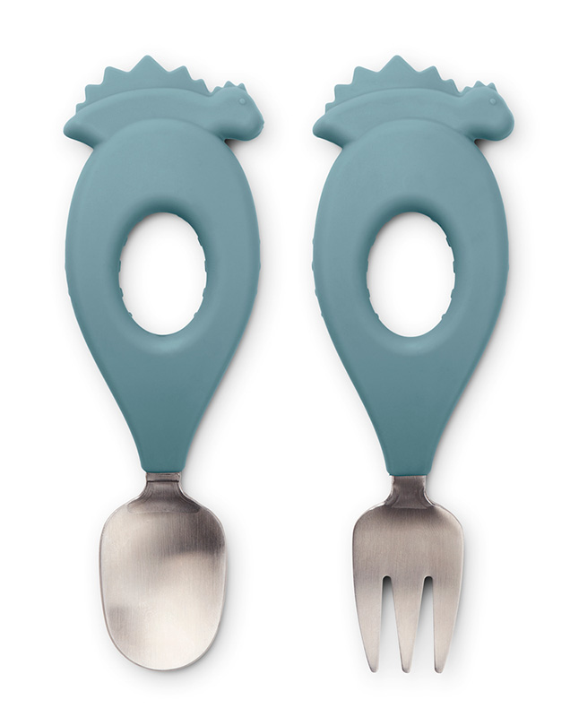 Liewood Stanley Dino whale blue aterimet sopivat loistavasti pieneen käteen leveän silikonisen varren ansiosta. Aterimien varsi on pehmeää silikonia, joista lapsen pienten sormien on helppo tarttua kiinni. Lusikan ja haarukan pienet merkit helpottavat vauvaa aistimaan kuinka pitkälle ne menevät hänen suuhunsa. Haarukassa ja lusikassa on suloiset pienet eläinhahmot piristämässä pieniä ruokailuvälineitä.