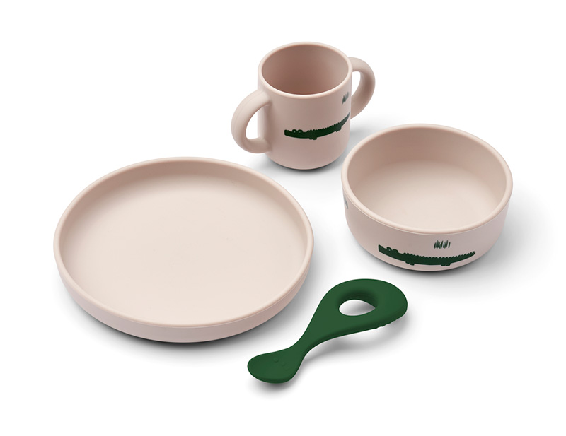 Liewood Vivi ruokailusetti lapselle, jossa on lautanen, kulho, muki ja lusikka. Setti on valmistettu 100% silikonista.