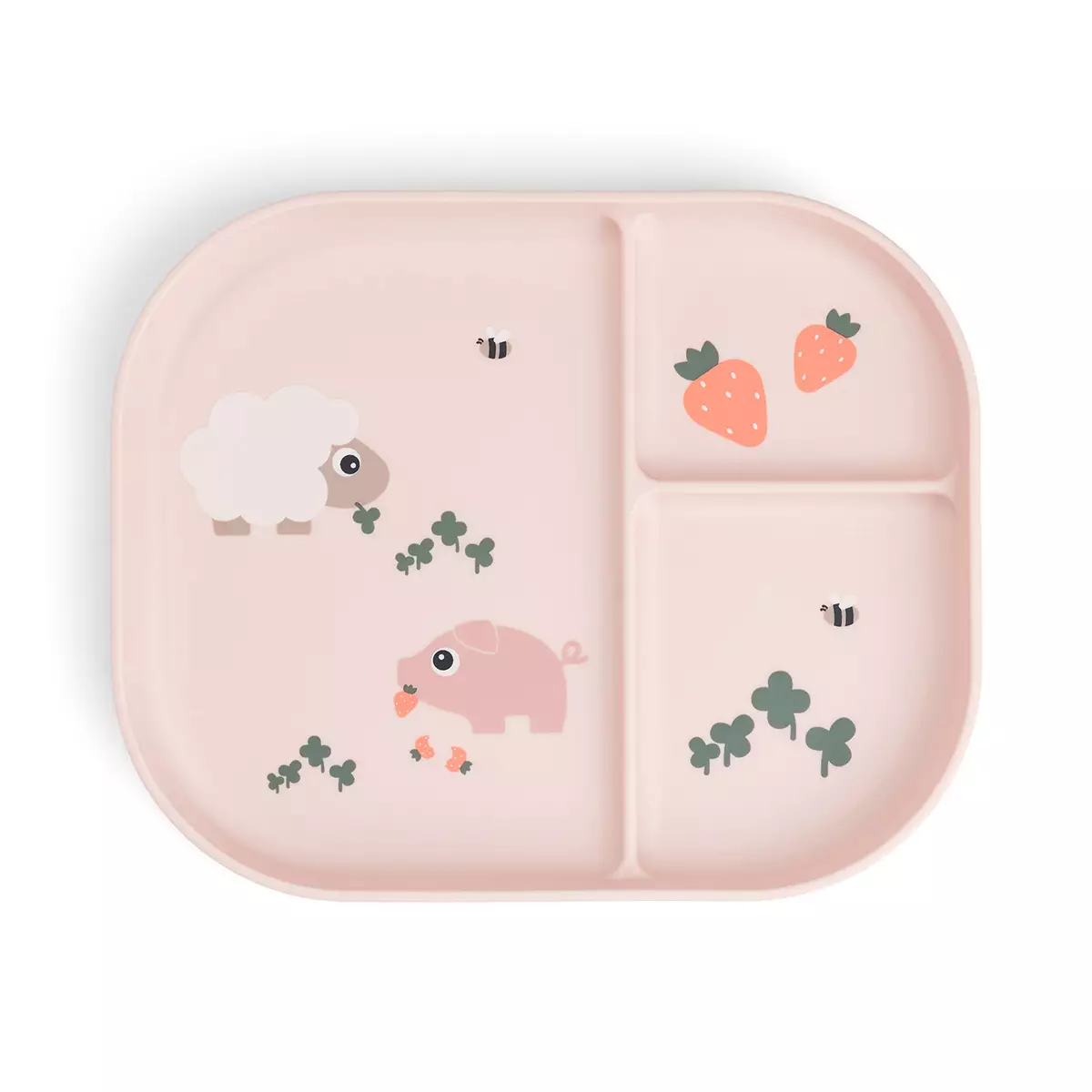 Lokerolautanen Done By Deer Foodie Tiny Farm Powder on suloinen lautanen lapselle. Lokerolautanen on käytännöllinen ja kiva lapselle ruokailuhetkiin. Lautanen on jaettu kolmeen osaan, joihin voit jakaa eri ruokia lapselle maisteltavaksi. Vaaleanpunaisen lautasen pohjasta pilkistää suloinen possu ja lammas.