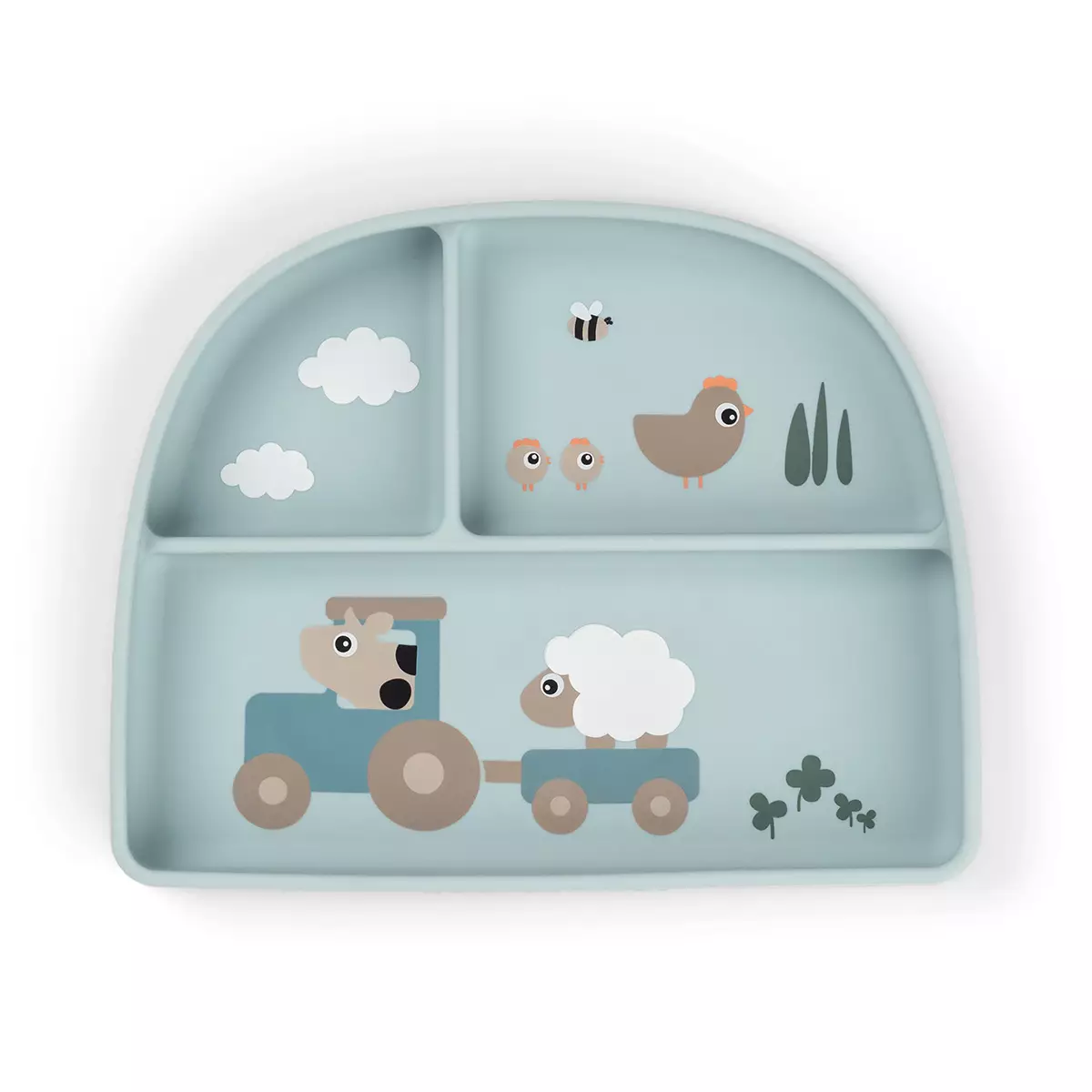Silikonilautanen imukupilla Done By Deer Tiny Farm Blue on suloinen lautanen lapselle. Silikoninen lokerolautanen on käytännöllinen ja kiva lapselle ruokailuhetkiin. Lautasen pohjassa oleva imukuppi sujuvoittaa lapsen ruokailuhetkeä huomattavasti. Lautanen on jaettu kolmeen osaan, joihin voit jakaa eri ruokia lapselle maisteltavaksi. Hiekan värisen lautasen pohjasta pilkistää suloinen lehmä ja lammas.