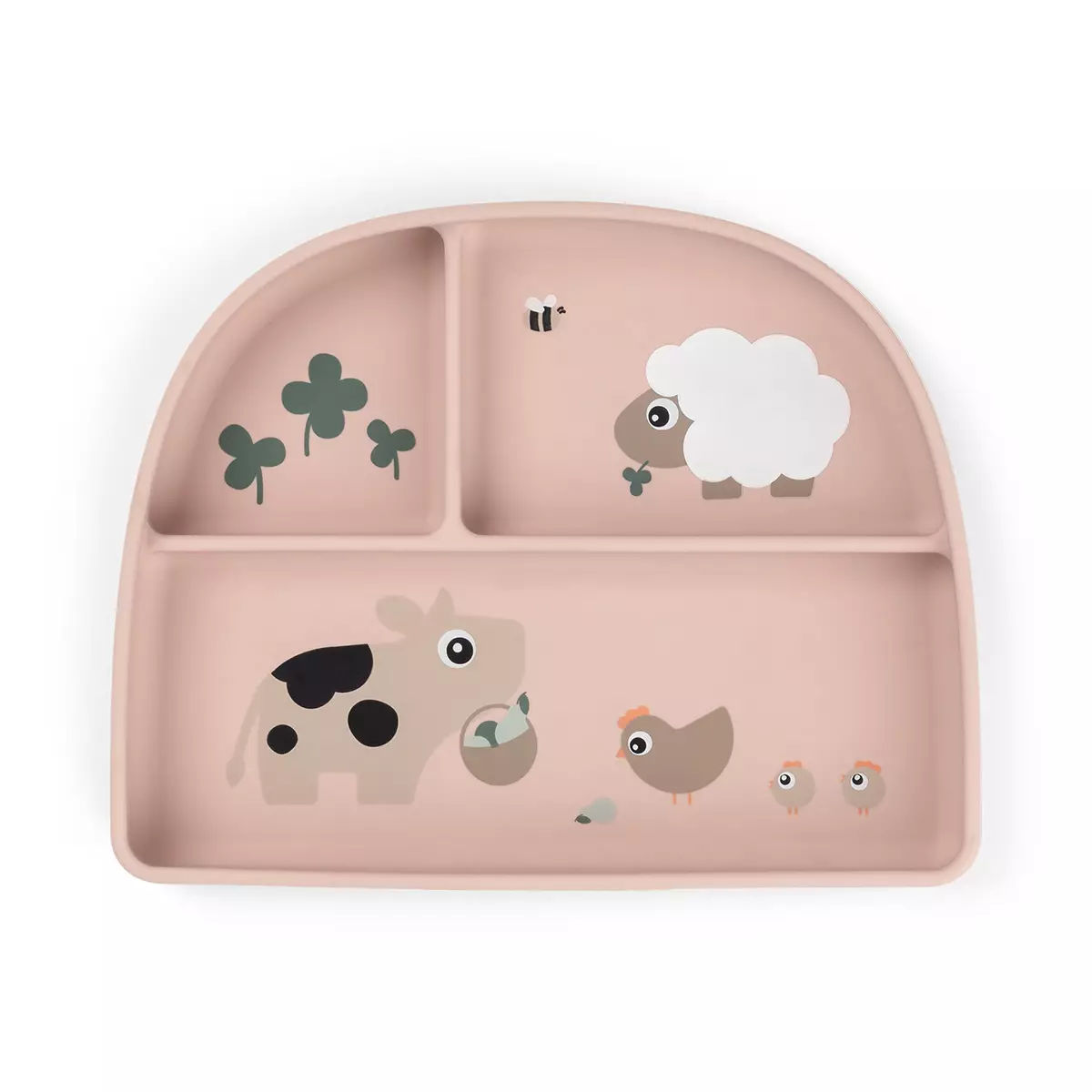 Silikonilautanen imukupilla Done By Deer Tiny Farm Powder on suloinen lautanen lapselle. Silikoninen lokerolautanen on käytännöllinen ja kiva lapselle ruokailuhetkiin. Lautasen pohjassa oleva imukuppi sujuvoittaa lapsen ruokailuhetkeä huomattavasti. Lautanen on jaettu kolmeen osaan, joihin voit jakaa eri ruokia lapselle maisteltavaksi. Hiekan värisen lautasen pohjasta pilkistää suloinen lehmä ja lammas.