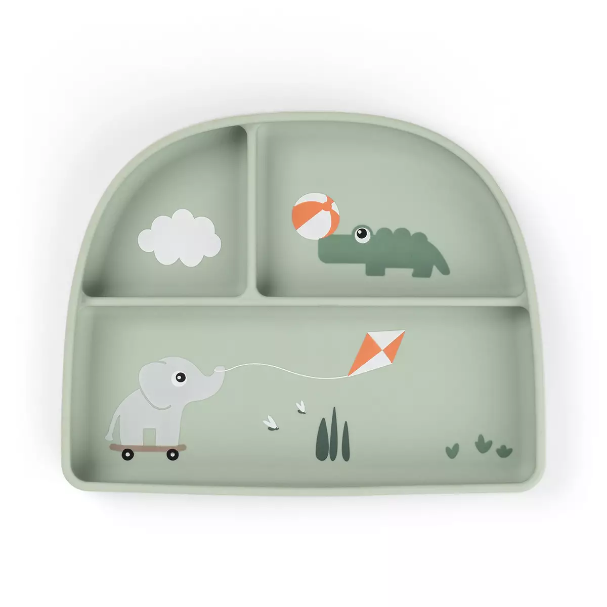 Silikonilautanen imukupilla Done By Deer Playground Green on suloinen lautanen lapselle. Silikoninen lokerolautanen on käytännöllinen ja kiva lapselle ruokailuhetkiin. Lautasen pohjassa oleva imukuppi sujuvoittaa lapsen ruokailuhetkeä huomattavasti. Lautanen on jaettu kolmeen osaan, joihin voit jakaa eri ruokia lapselle maisteltavaksi. Vihreän värisen lautasen pohjasta pilkistää suloiset eläinystävät krokotiili ja norsu.