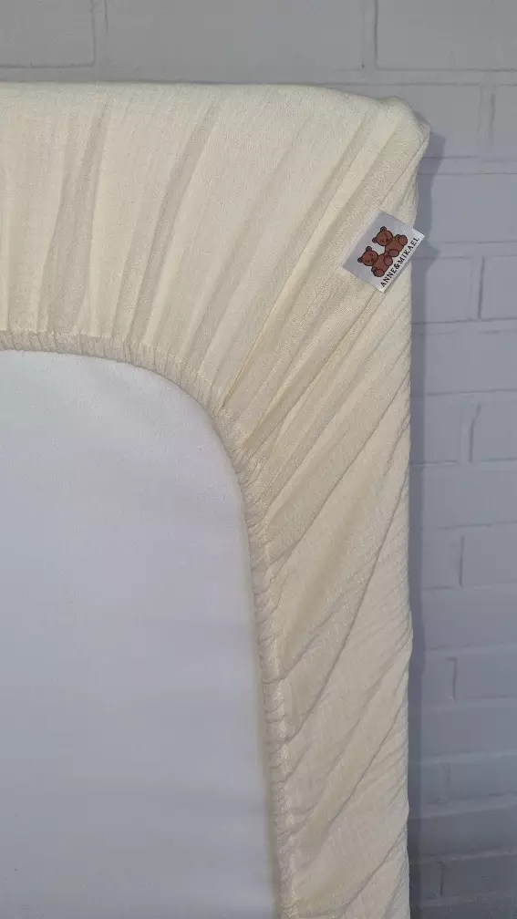 Pehmeä, Kerman sävyinen harsokankainen lakana tuntuu hyvältä vauvan herkällä iholla. Kuminauha on ommeltu kokonaan ympäri, jotta lakana on helppo pedata ja se pysyy hyvin paikoillaan. Sopii 60cm leveään ja 120cm pituiseen patjaan.