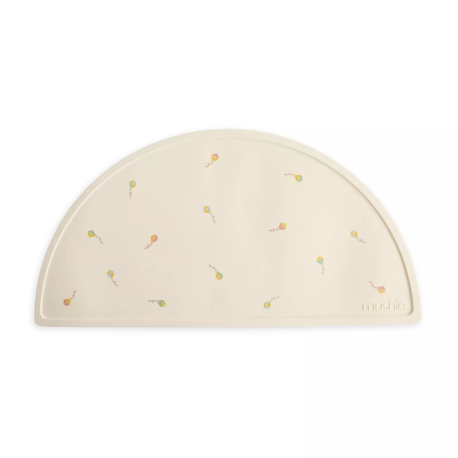 Puoliympyrän muotoinen silikoninen Mushie ruokailualusta. Ruokailualustassa on leijan kuvia. Liukumaton alusta astioille.
