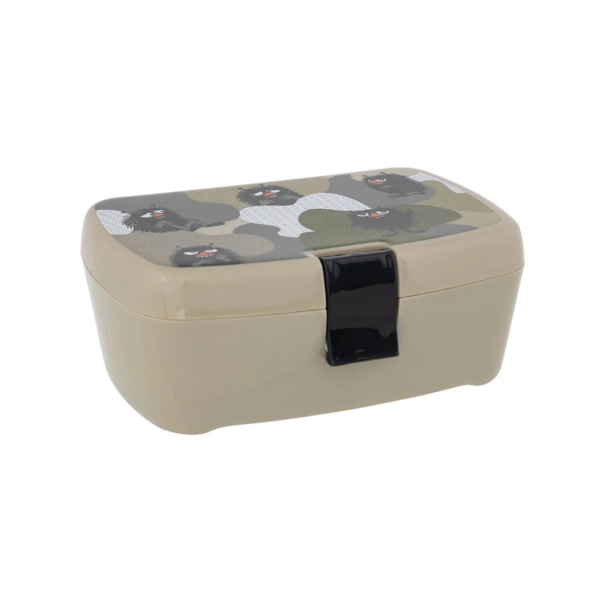 Oliivin vihreä eväsrasia lapselle. Kaksikerroksinen eväsrasia, jonka kannessa on Haisulin kuvia.