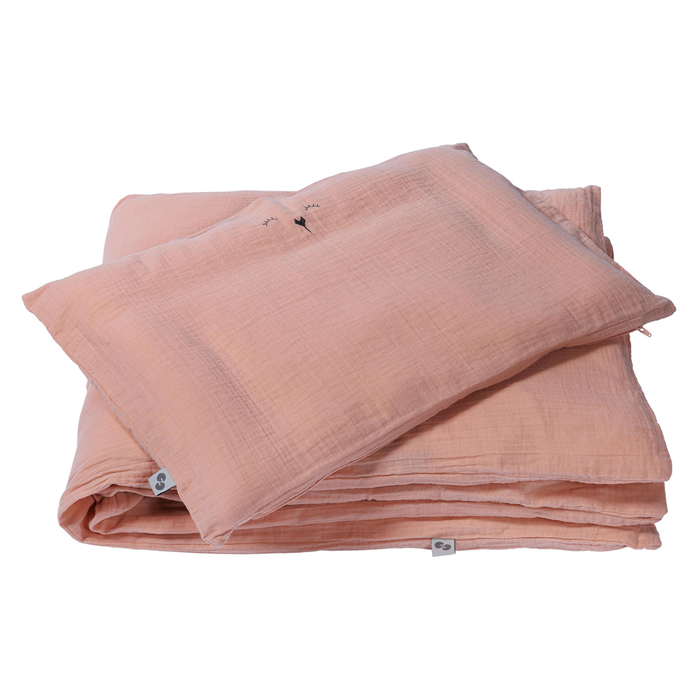 Hempeä vaaleanpunainen pussilakanasetti on helppo yhdistellä muihin lapsen sängyn tekstiileihin.