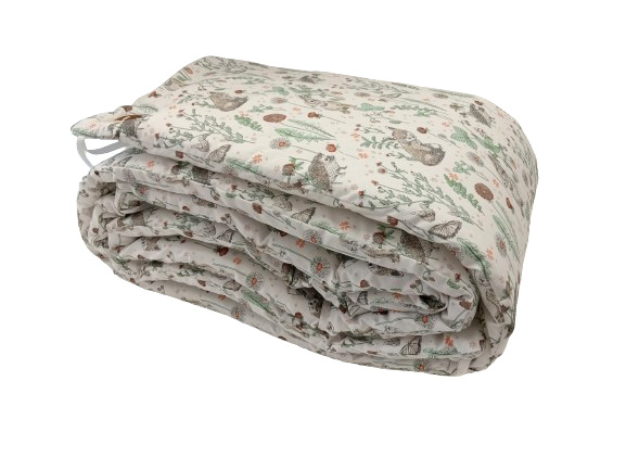 Pinnasängyn reunapehmuste Anne & Mikael, Mansikkaniitty valkoinen on kaunis pehmuste vauvan sänkyyn, jossa on vaalealla pohjalla pupuja, siilejä ja kettuja luonnonkukkien seassa. Reunapehmuste pehmustaa pinnasängyn kovat reunat niin, ettei vauva kolhi itseään pinnoihin tai saa jalkojaan pinnojen väliin.