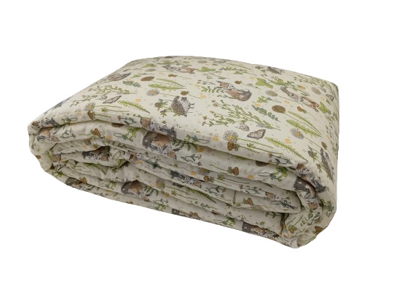 Pinnasängyn reunapehmuste Anne & Mikael, Mansikkaniitty vihreä on kaunis pehmuste vauvan sänkyyn, jossa on vihertävällä pohjalla pupuja, siilejä ja kettuja luonnonkukkien seassa. Reunapehmuste pehmustaa pinnasängyn kovat reunat niin, ettei vauva kolhi itseään pinnoihin tai saa jalkojaan pinnojen väliin.