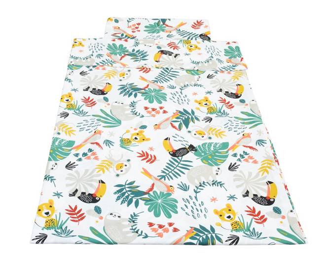 Pehmoinen pussilakanasetti vauvan sänkyyn. Setissä on pussilakana ja tyynyliina, jotka on koristettu tropiikin eläimillä.