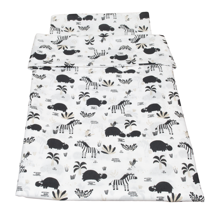Pussilakanasetti vauvalle Anne & Mikael Hippo on pehmoinen puuvillainen pussilakanasetti mustavalkoisella eläinkuosilla.