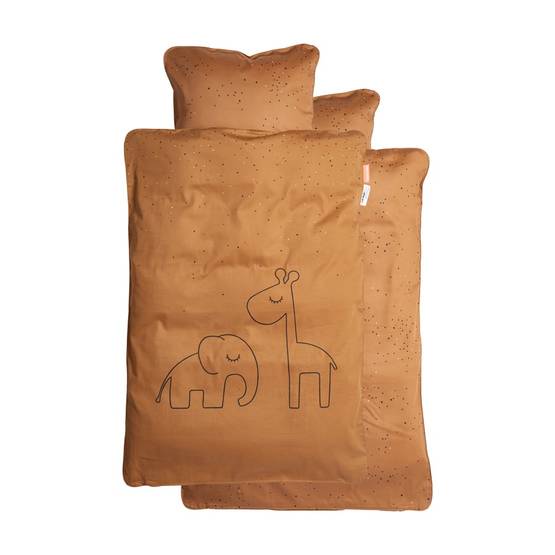 Pussilakanasetti vauvalle Done By Deer Dreamy dots mustard sisältää ihanan pehmeät, puuvillaiset pussilakanan ja tyynyliinan. Kauniissa ruskean sävyisissä liinavaatteissa Raffi kiraffi ja Elphee norsu ovat jo untenmailla.