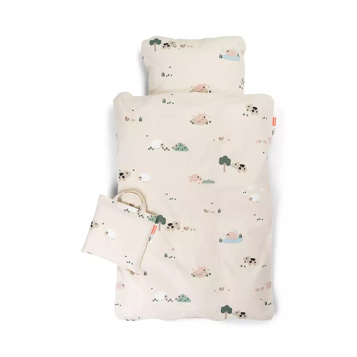 Done By Deer pussilakanat on pehmeää puuvillaa, jotka on kuvitettu suloisilla maatilan eläinhahmoilla. Koko 70 x 100cm.