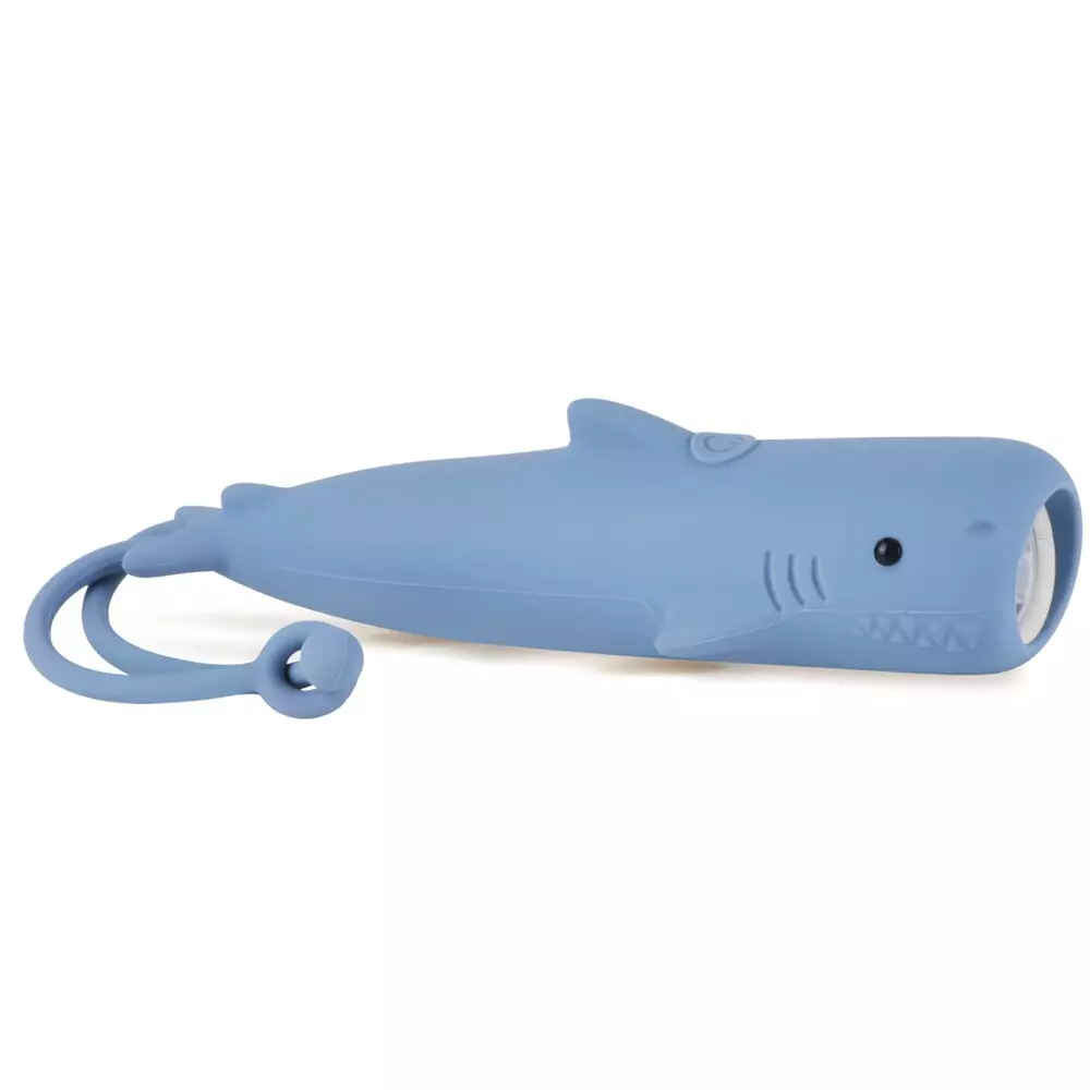 Rabbit & Friends yövalo taskulamppu Shark Sharky on hauska hain muotoinen taskulamppu, joka toimii myös yövalona. Täydellinen yhdistelmä hauskuutta ja toimivuutta! Taskulampussa on kaksi eri kirkkaudensäätöä ja sopii täydellisesti ulos pimeneviin iltoihin seikkailuihin, leikkeihin ja iltasatuhetkiin. Liukumattoman silikonipinnan ansiosta valo pysyy tukevasti kädessä.