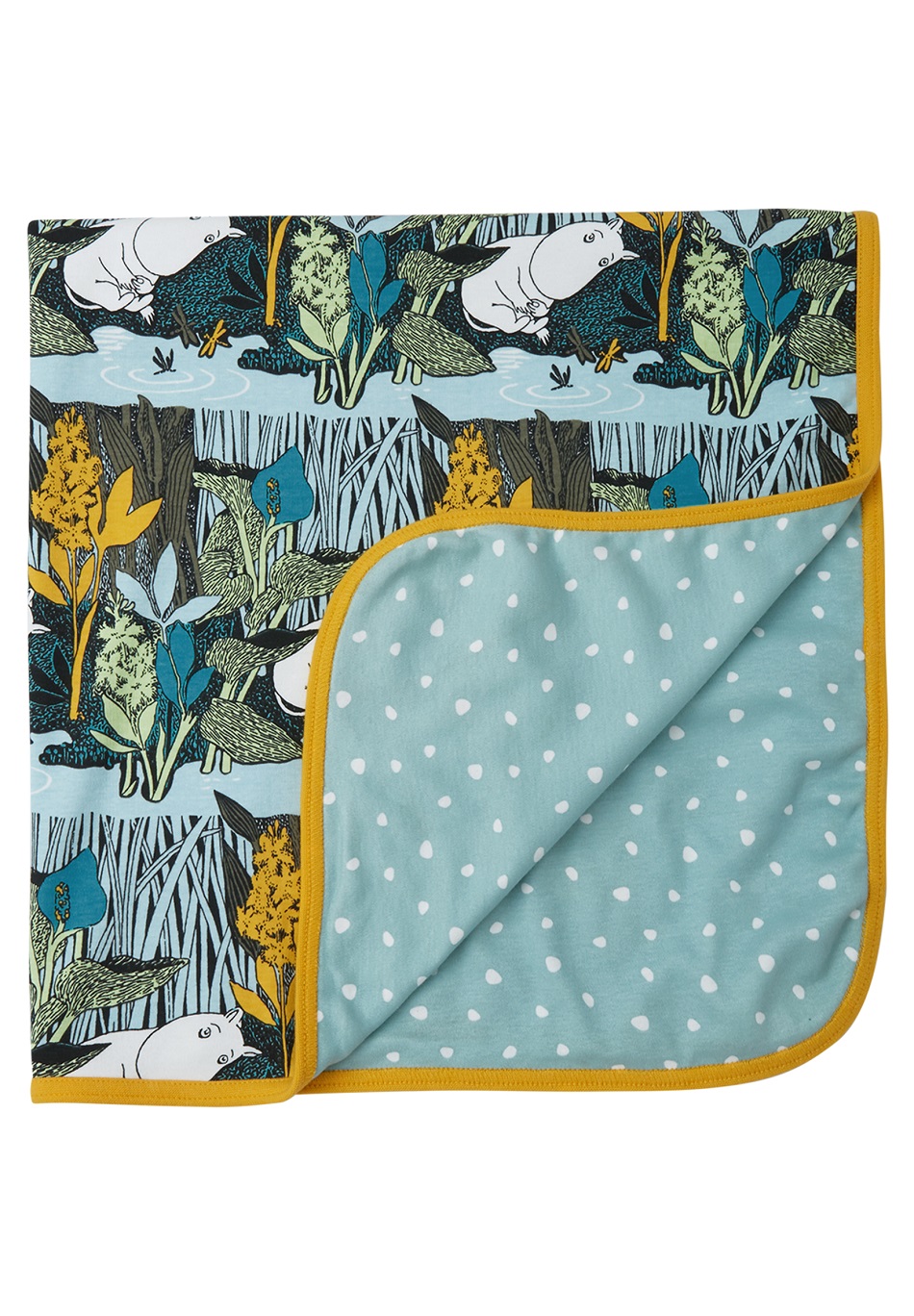 Kaksipuolinen Reima Muumi vauvan peitto. Peitto on joustavaa puuvillaneulosta ja lapsen mukava nukkua sen alla tai köllötellä peiton päällä.