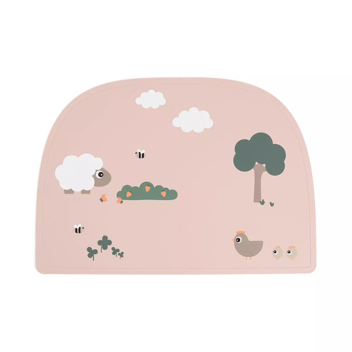 Ruokailualusta Done By Deer Tiny Farm Powder tekee ruokailusta hauskaa. Silikonisella alustalla ruokailuvälineet pysyvät paremmin paikoillaan ja se suojaa pöytää ruoalta ja kolhuilta. Alustan pienet reunat estävät nesteen valumisen pöydälle.