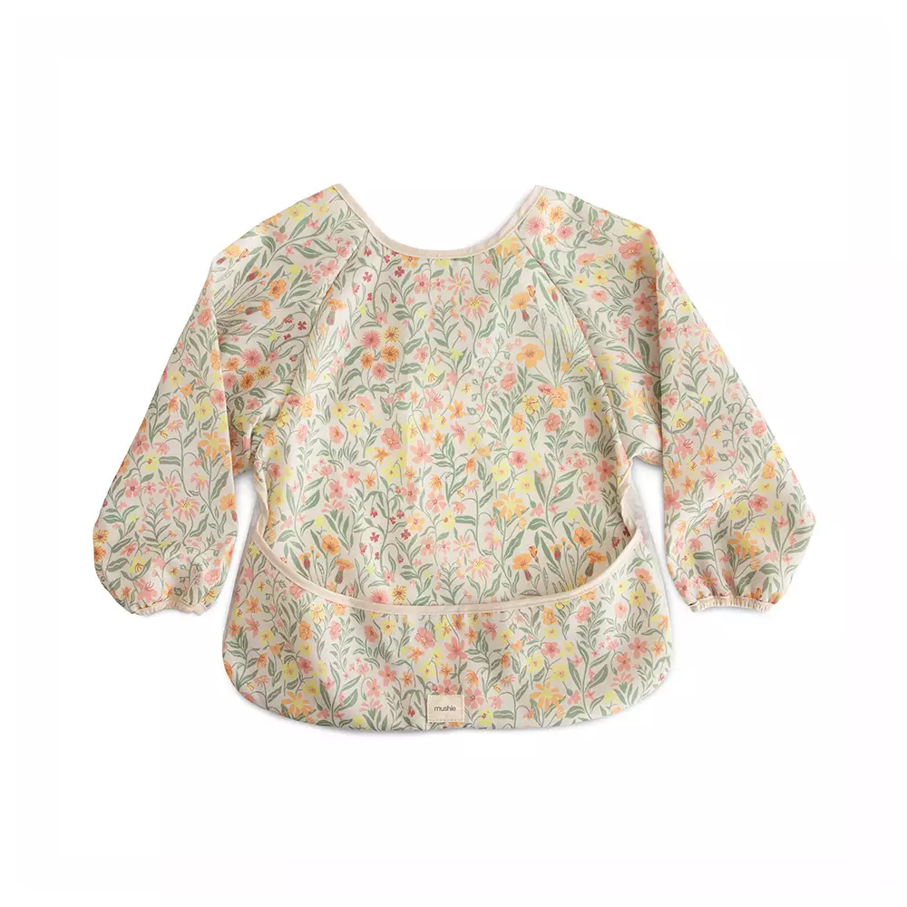 Ruokalappu hihoilla Mushie Pastel Blooms suojaa lapsen vaatteet ruokailujen, askarteluiden ja muiden sotkuisten puuhien aikana. Sen leveä tasku kerää ohi menevän ruoan ja pysyy hyvin paikoillaan tarrakiinnityksen ansiosta. Huuhdo puhtaaksi ja ripusta kuivumaan tai heitä pesukoneeseen!