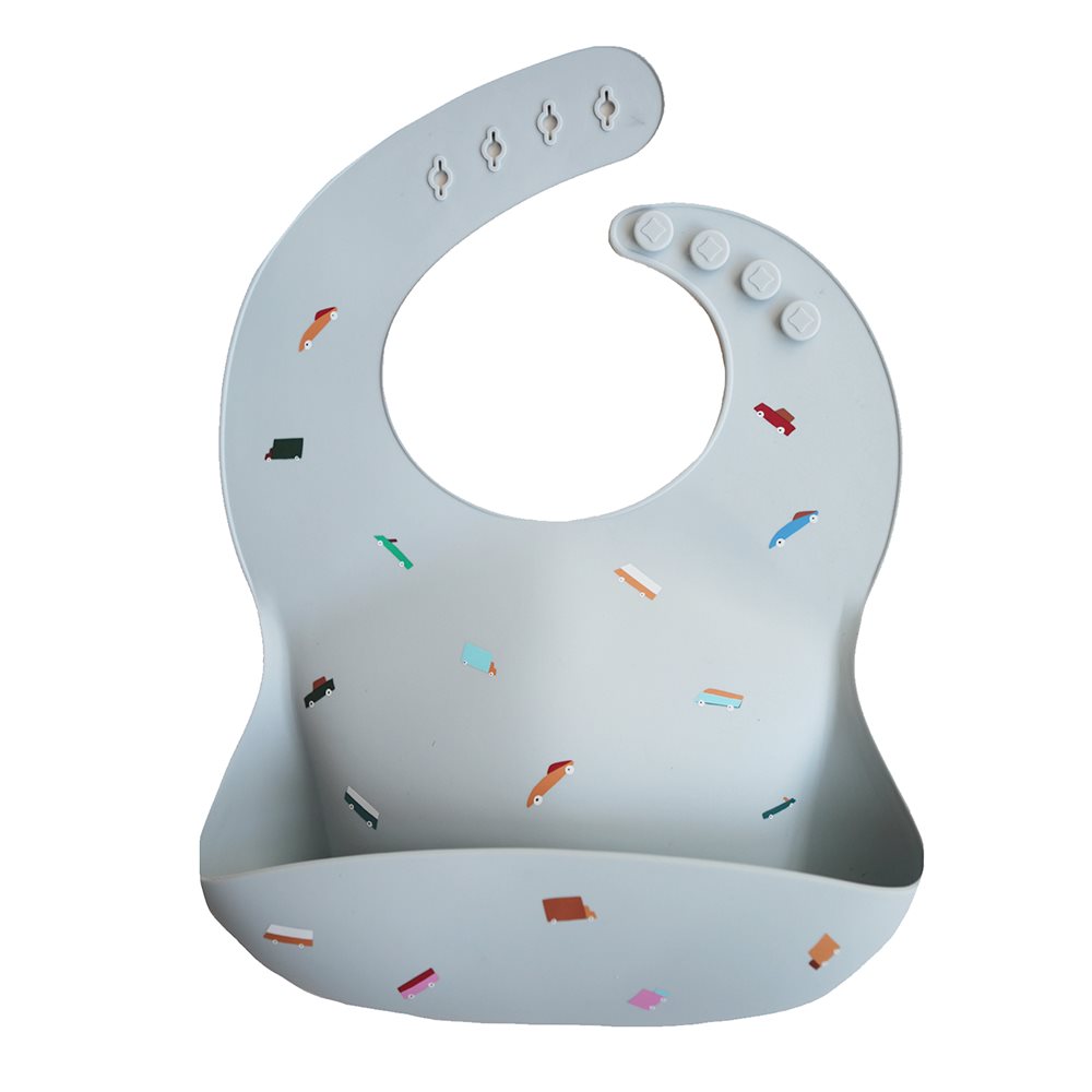 Ruokalappu Mushie, silikonia Retro Cars on hauska autoaiheinen ruokalappu. Ruokalappu on pehmeää silikonia ja se on mukava lapsen päällä. Ruokalapun kouru kerää kaikki ohimenneet ruuat, eikä niitä tarvitse kerätä lattialta.