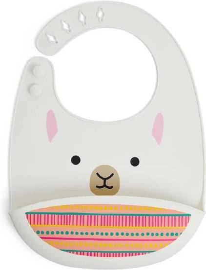 Ruokalappu silikonia SkipHop Laama helpottaa ruokailuhetkiä lapsen kanssa. Ruokalappu on helposti puhtaana pidettävää silikonia, jonka voi pyyhkäistä tai huuhdella puhtaaksi käytön jälkeen. Ruokalappu ei kasvata pyykkivuorta!