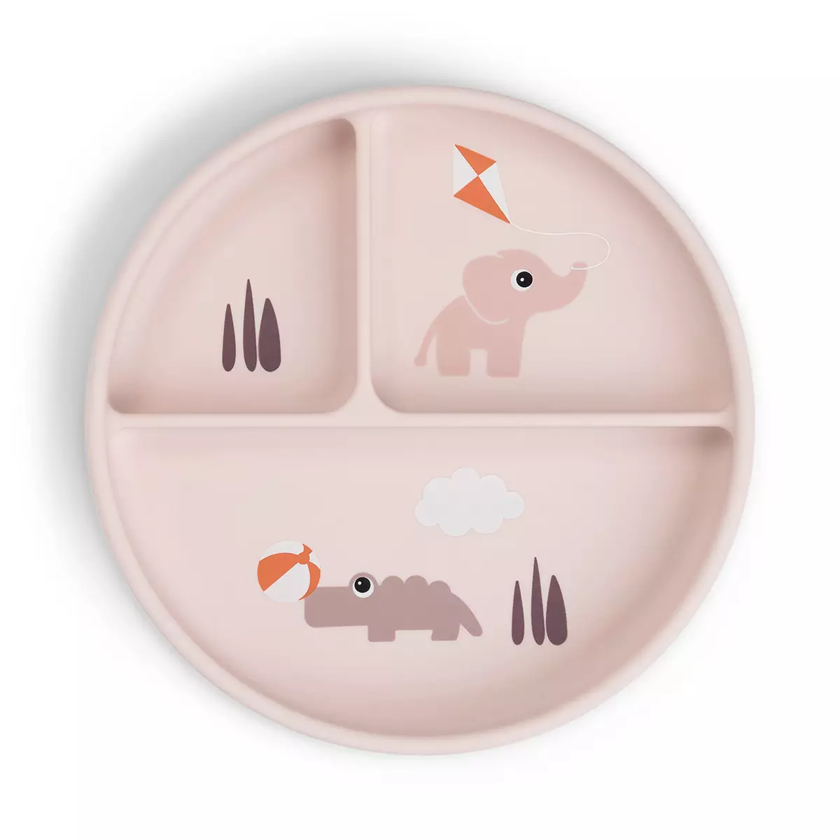 Silikonilautanen imukupilla Done By Deer Playground on suloinen lautanen lapselle. Silikoninen lokerolautanen on käytännöllinen ja kiva lapselle ruokailuhetkiin. Lautanen on jaettu kolmeen osaan, joihin voit jakaa eri ruokia lapselle maisteltavaksi. Vaaleanpunaisen lautasen pohjasta pilkistää suloiset eläinystävykset norsu ja kroko.