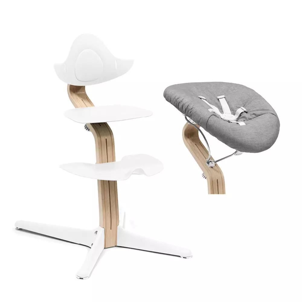 Stokke Nomi Chair tuoli & Newborn set Natural/White ja White/Grey Sand sisältää Stokke Nomi syöttötuolin värissä Natural/White ja Baby Setin värissä White/Grey Sand.