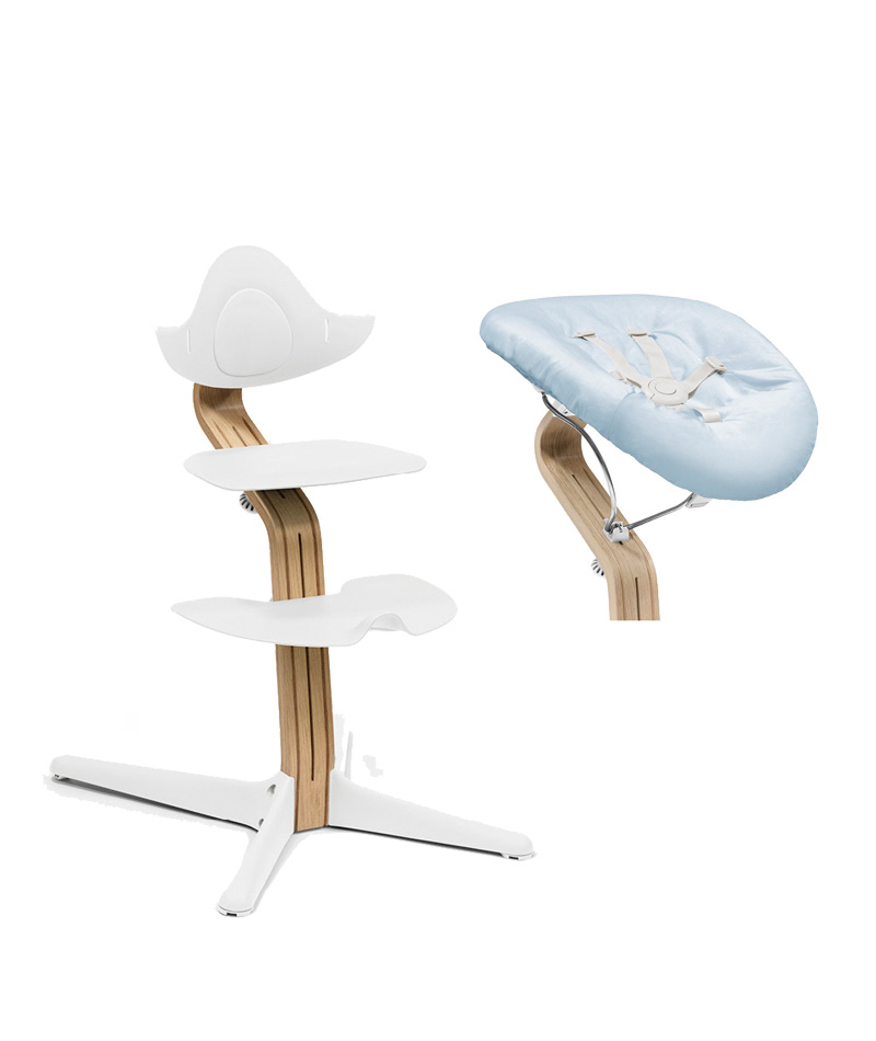 Stokke Nomi Chair tuoli & Newborn set Oak/White ja Grey/Blue sisältää Stokke Nomi syöttötuolin värissä Oak/White ja Baby Setin värissä Grey/Blue.