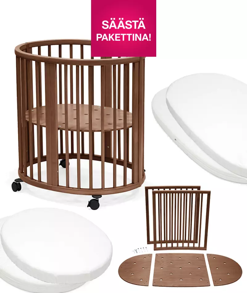 Stokke Sleepi Big Bundle Warm Brown V3 sisältää Stokken Sleepi Mini V3 pinnasängyn, Extension lisäpalat sängyn kasvattamiseksi sekä patjat että muotolakanat molempiin sänkykokoihin. Kaunis ovaalinmuotoinen pinnasänky vauvanhuoneeseen. Sänkyä on helppo liikutella äänettömästi paikasta toiseen renkaiden avulla.