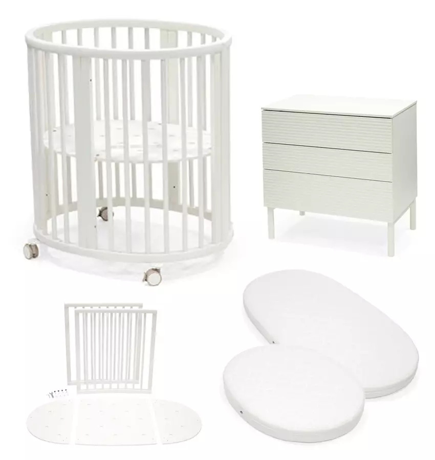 Stokke Sleepi Mini ja Sleepi Dresser starttipaketti White V3 sisältää Stokken Sleepi Mini V3 pinnasängyn, patjat molempiin sänkykokoihin, Extension lisäpalat sängyn kasvattamiseksi sekä kauniin Sleepi Dresser lipaston.