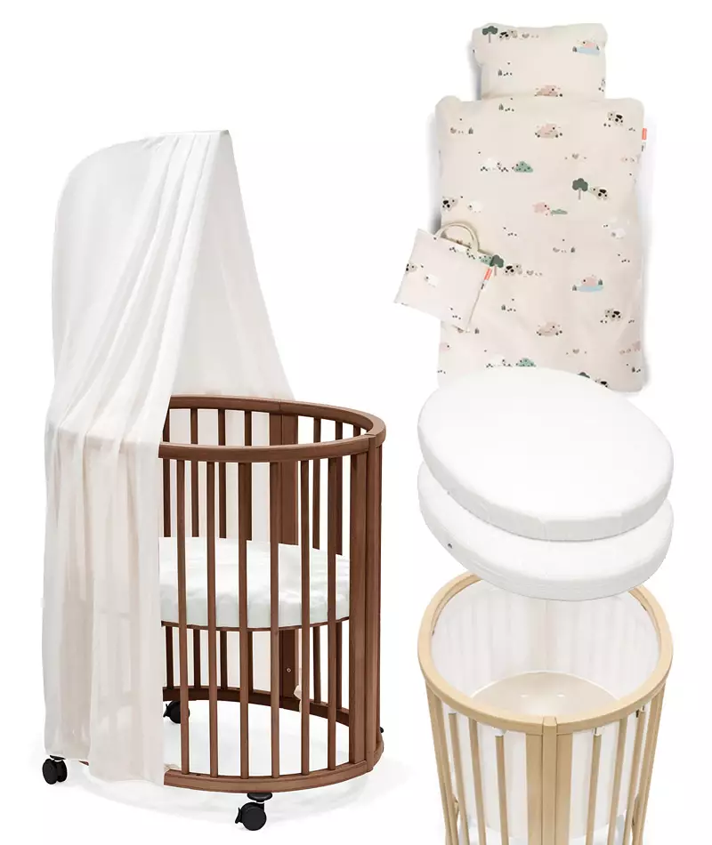 Stokken ovaalinmuotoinen pinnasänky tarvikkeineen. Starttipaketti, jossa on pinnasänky sekä kaikki lisävarusteet Stokke Sleepi Mini V3 sänkyyn.