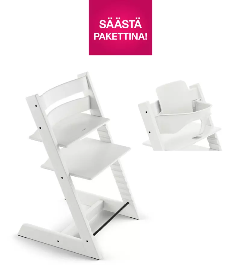 Tämä syöttötuolipaketti sopii lapsen käytöön 6 kk iästä alkaen, kun lapsi osaa istua itse. Voit käyttää Tripp Trapp syöttötuolia niin kauan kuin tahdot, sillä istuinosaa ja jalkatukea säätämällä Tripp Trapp taipuu koululaistuoliksi asti. Ja voit istua tuolissa itsekin, painoraja on 136 kg!