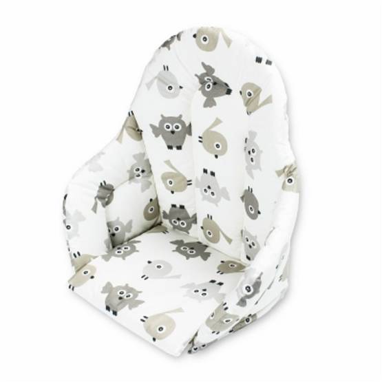 Istuinpehmusteessa on harmaansävyisiä pöllöjä. Istuinpehmuste on yleismalli, joka sopii useimpiin syöttötuoleihin.