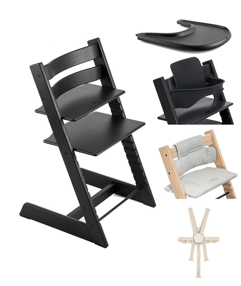 Tripp Trapp starttipaketti Stokke 5 in 1 Oak Black sisältää Stokken Tripp Trapp syöttötuolin, mustan Baby Setin ja tarjottimen sekä valjaat ja istuinpehmusteen.
