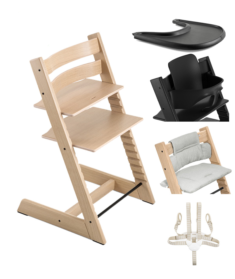Tripp Trapp starttipaketti Stokke 5 in 1 Oak Natural sisältää Stokken Tripp Trapp syöttötuolin, mustan Baby Setin ja tarjottimen sekä valjaat ja istuinpehmusteen.