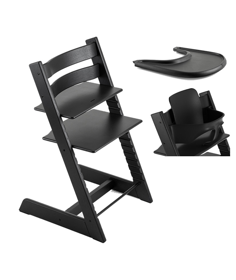 Tripp Trapp starttipaketti Stokke Oak Black sisältää Stokken Tripp Trapp syöttötuolin, Baby Setin ja tarjottimen.
