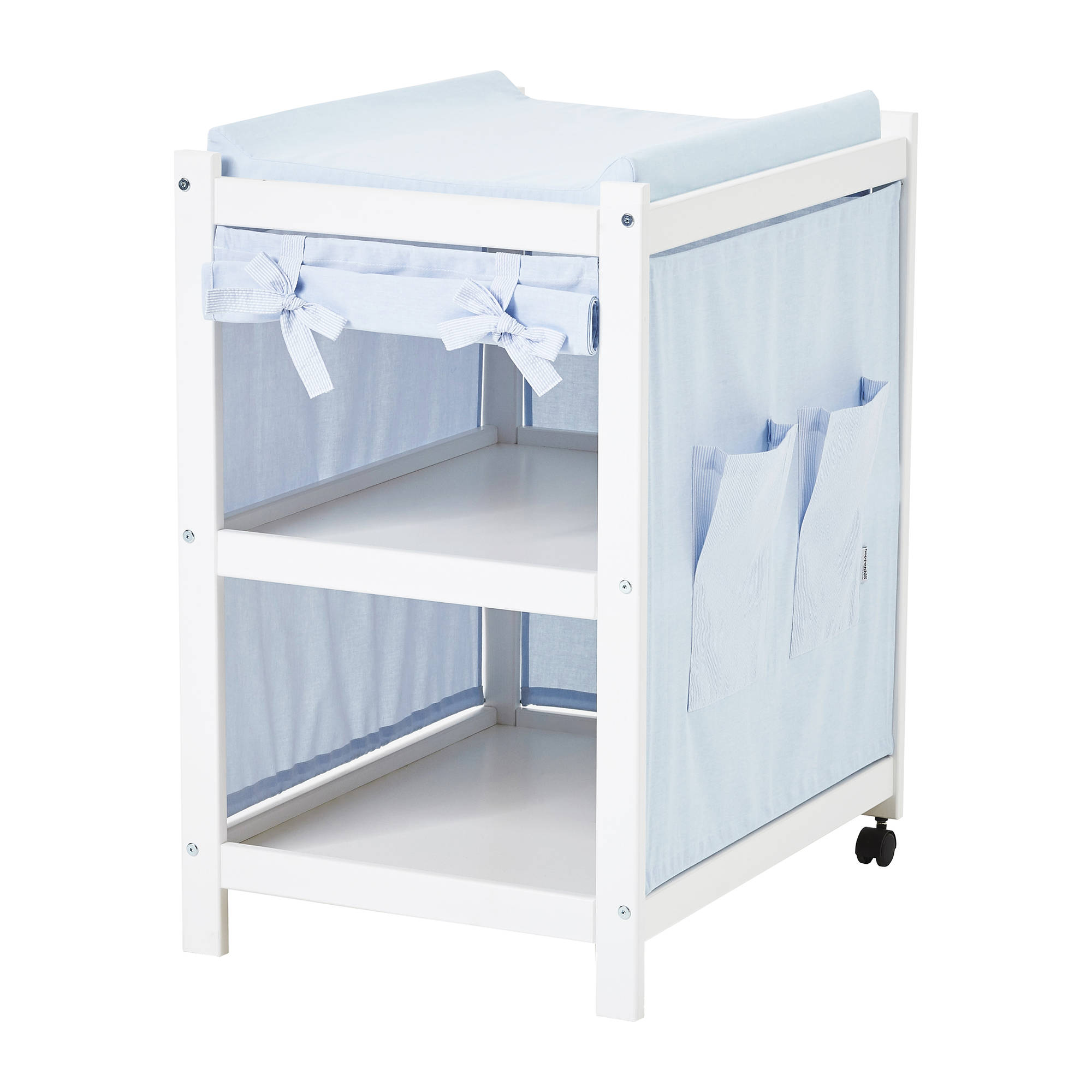 Suloinen lajitelma tekstiilejä IDA-MARIE hoitopöytään. Verhot on helppo asentaa ja isot taskut mahdollistavat enemmän säilytystilaa. Valmistettu Öko-Tex 100-sertifioiduista tekstiileistä.