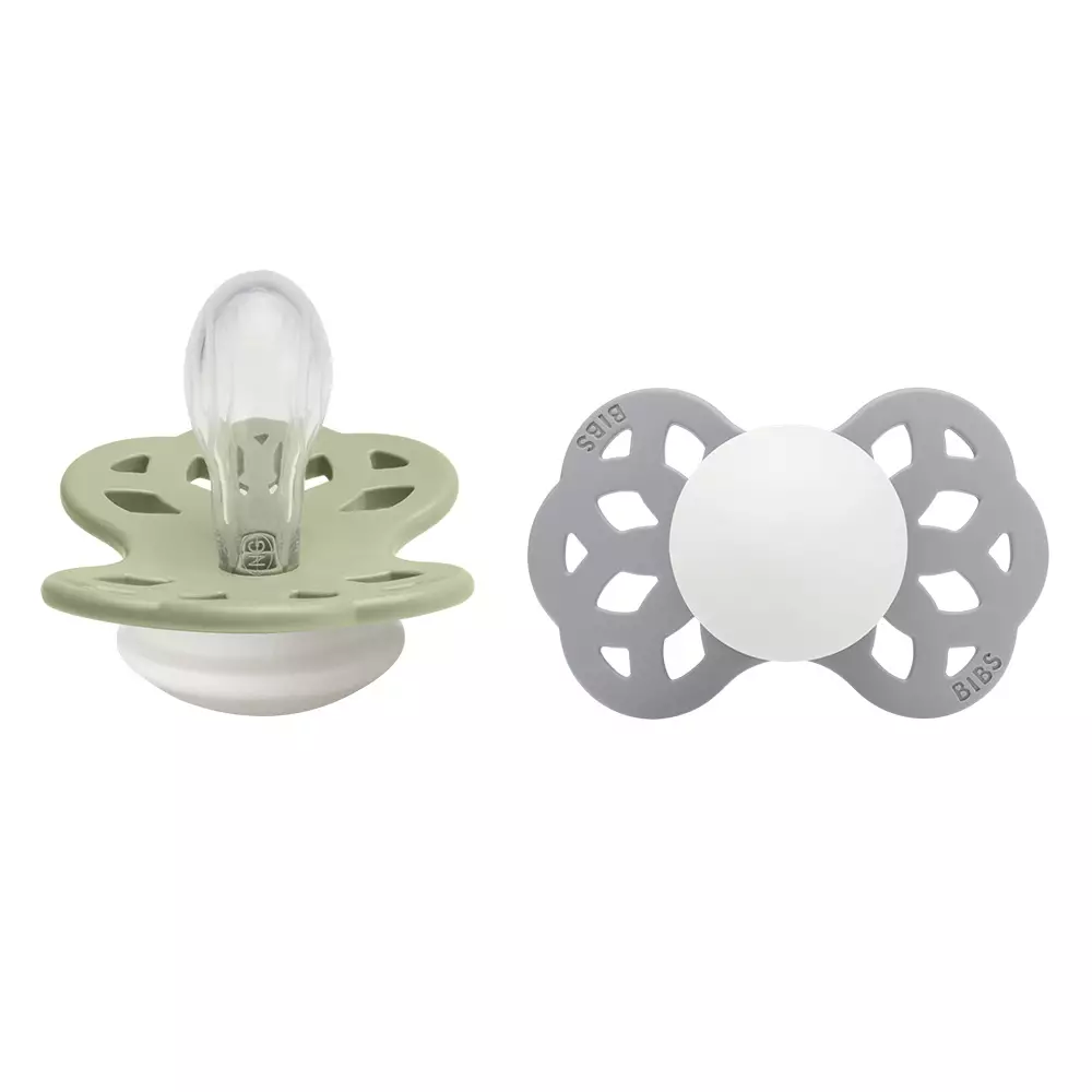 Bibs Infinity silikonitutti 2 kpl 0-6 kk, symmetrical, Sage/Cloud Night paketissa on kaksi eriväristä tuttia, jotka sopivat vauvasta noin 6kk ikään asti. Bibs Night tutissa on pimeässä hohtava keskiosa, tutti on helppo löytää pimeässä, jos tutti putoaa suusta.