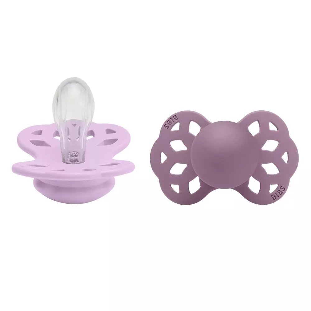 Bibs Infinity silikonitutti 2 kpl 0-6kk, symmetrical, Violet Sky/Mauve paketissa on kaksi eriväristä tuttia, jotka sopivat vauvasta noin 6kk ikään asti.