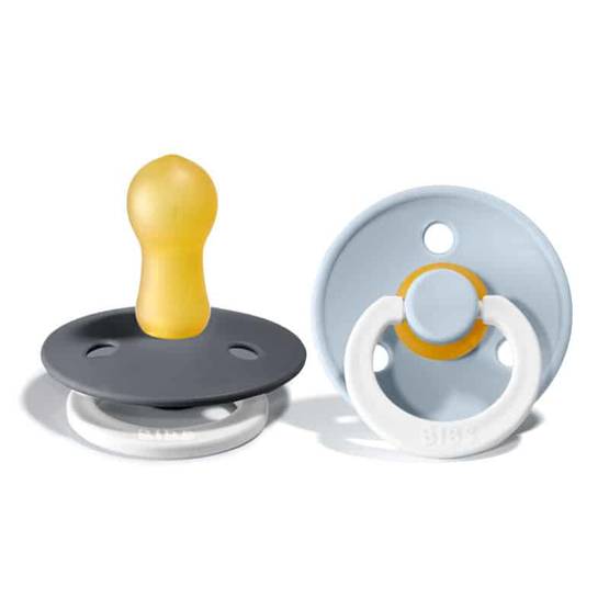 Bibs Night luonnonkumitutti 6-18 kk, Iron/BabyBlue on yöversio suositusta tuttimallista. Bibs Night luonnonkumitutissa on pimeässä hohtava tuttirengas. Tutti on helppo löytää pimeässä, jos tutti putoaa suusta.